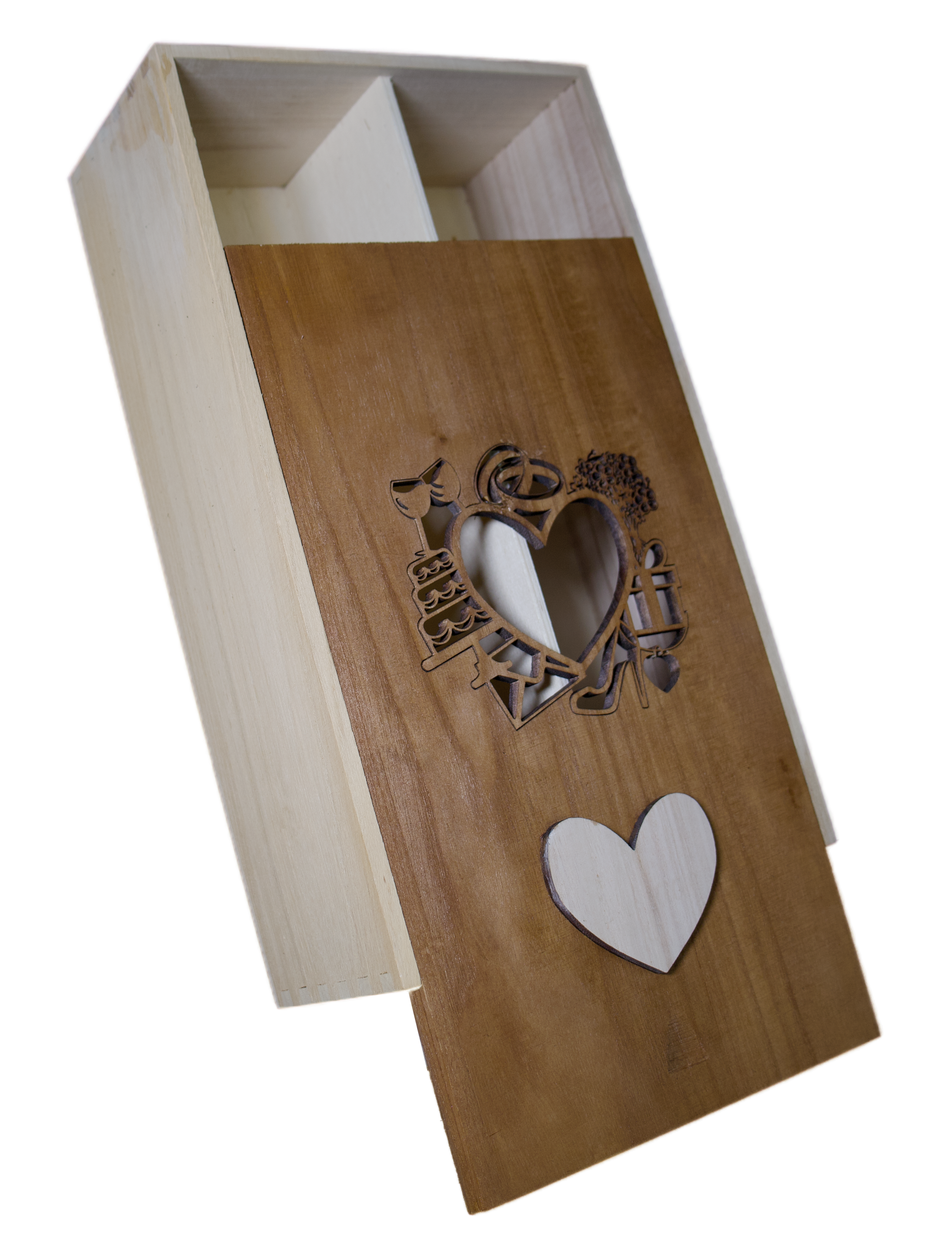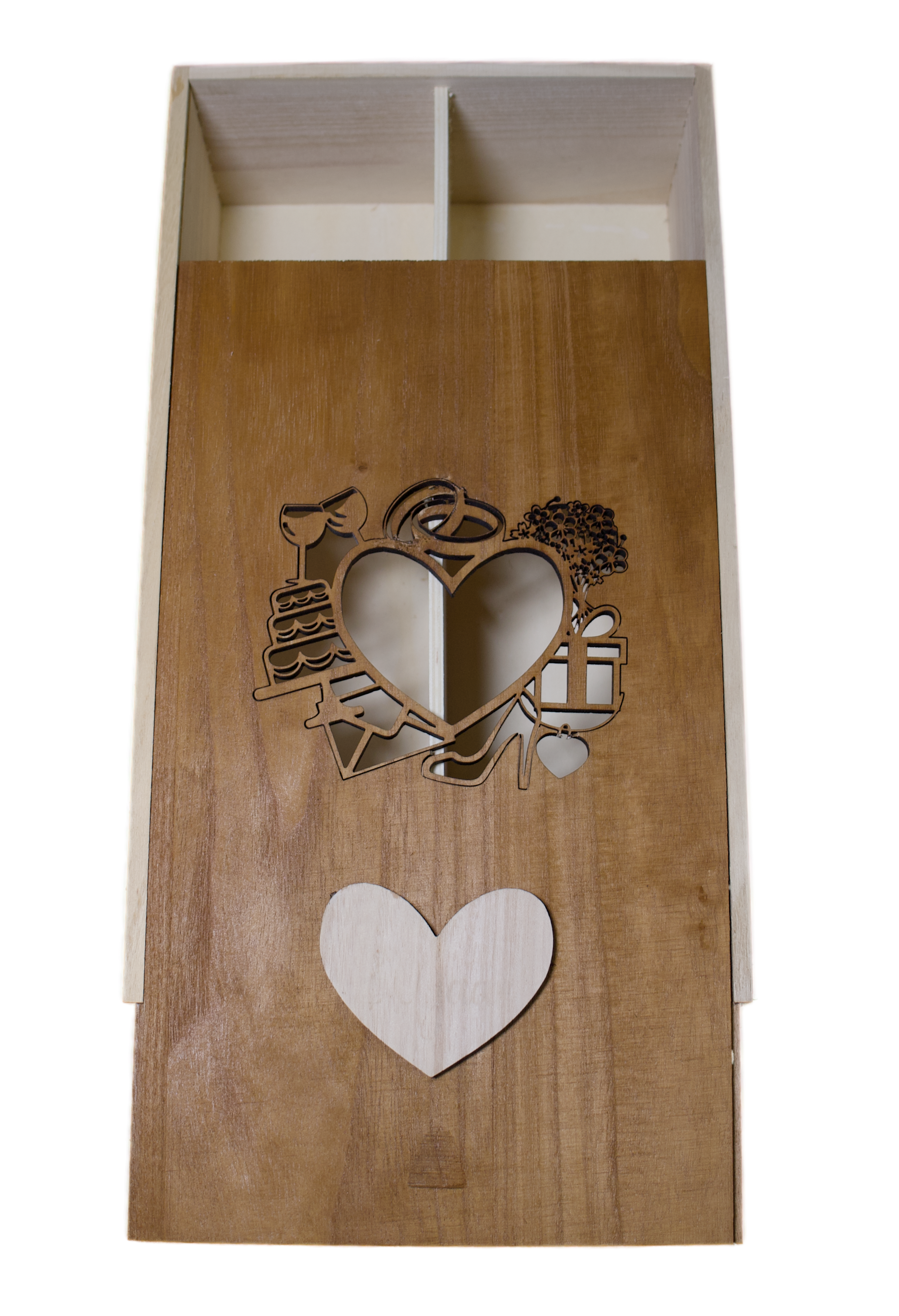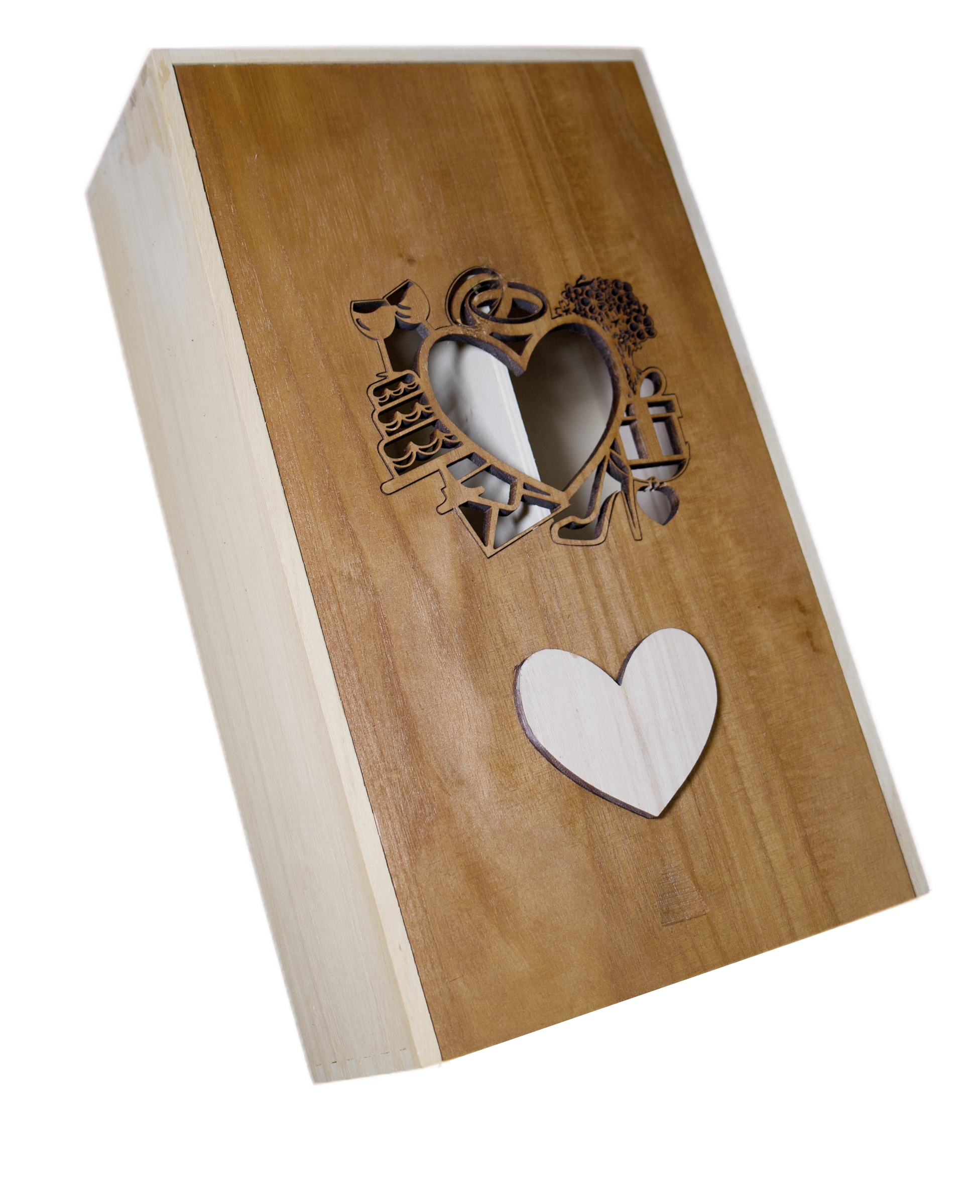 Het kistje is gemaakt van hoogwaardig hout en heeft een enkele, verfijnde uitsnede in de vorm van een hart, omringd door symbolen van liefde en verbondenheid.