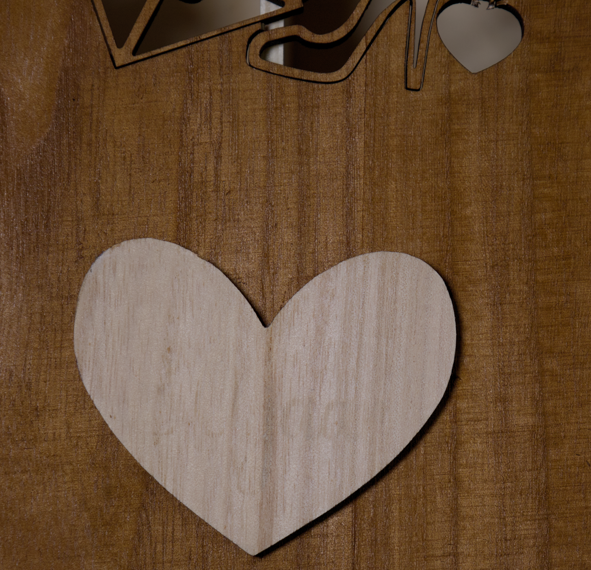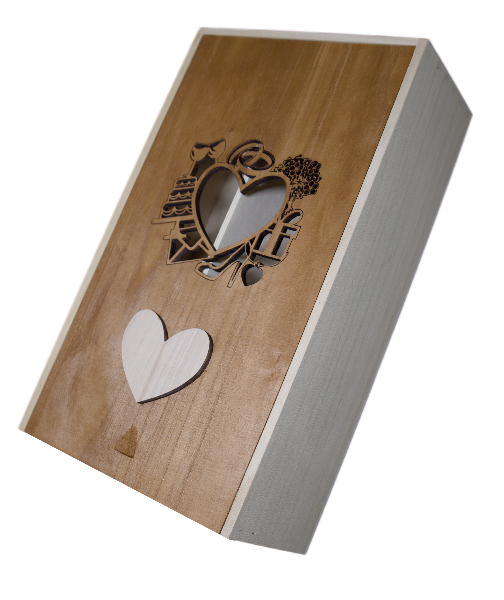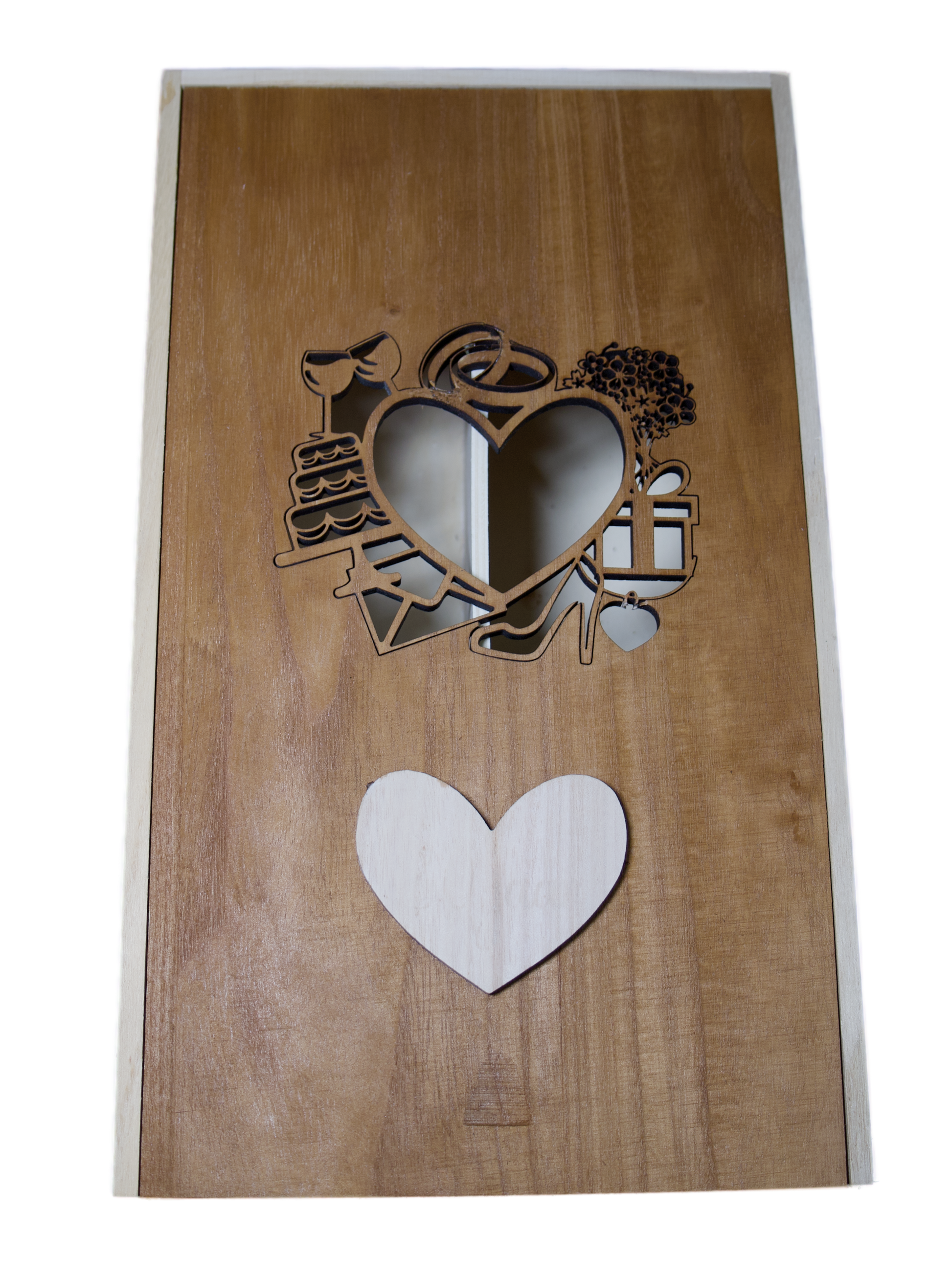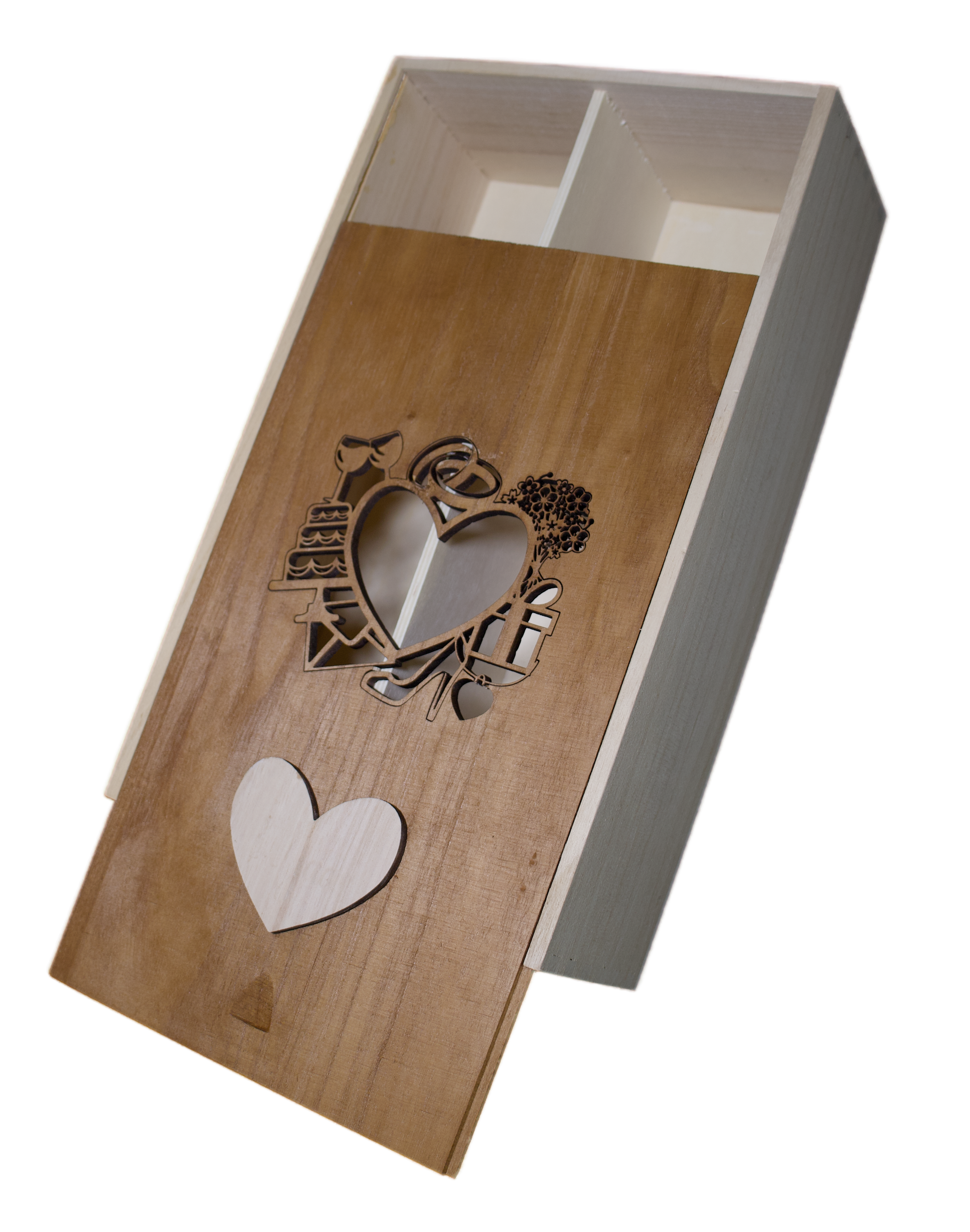 Het kistje is gemaakt van hoogwaardig hout en heeft een enkele, verfijnde uitsnede in de vorm van een hart, omringd door symbolen van liefde en verbondenheid.