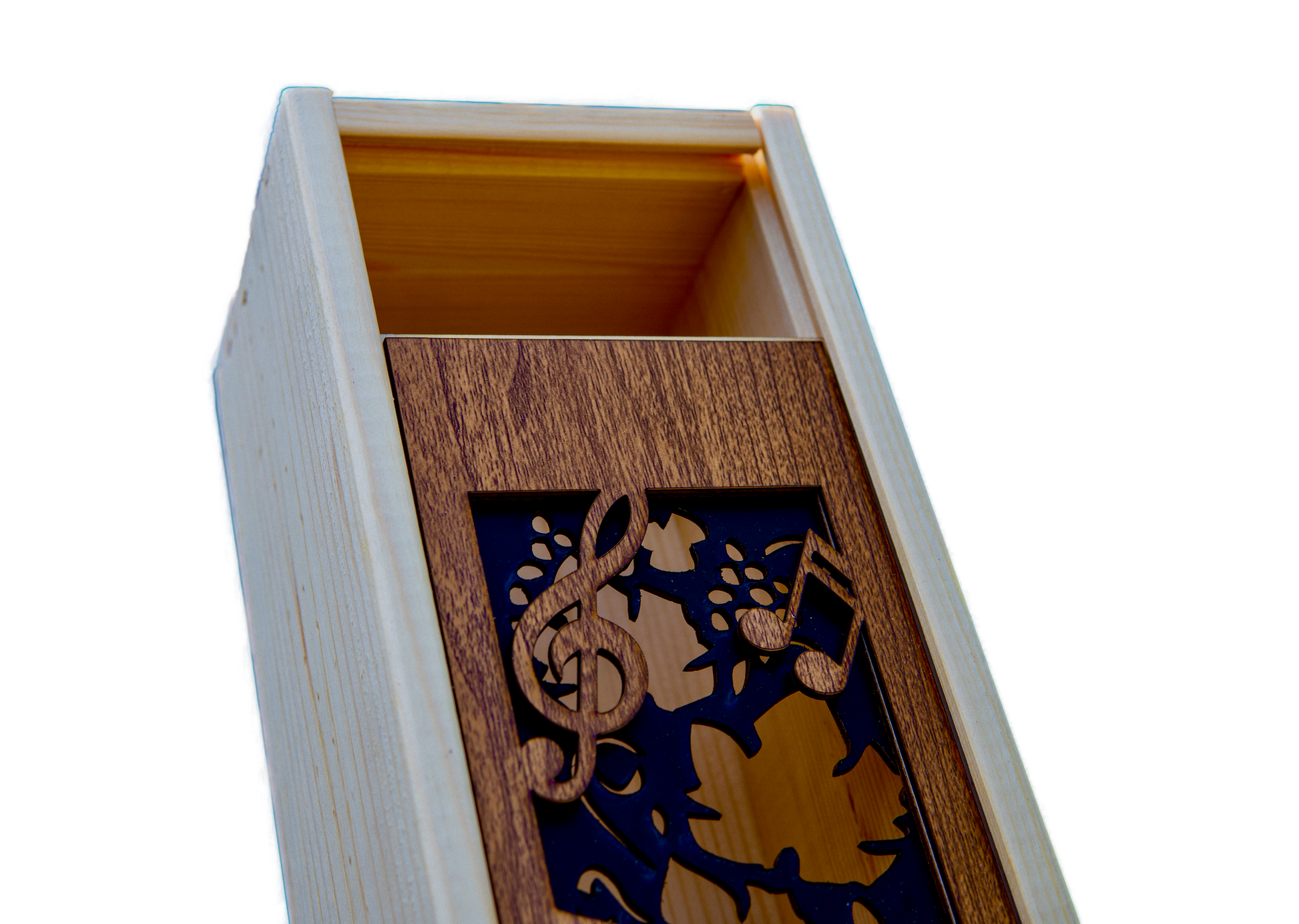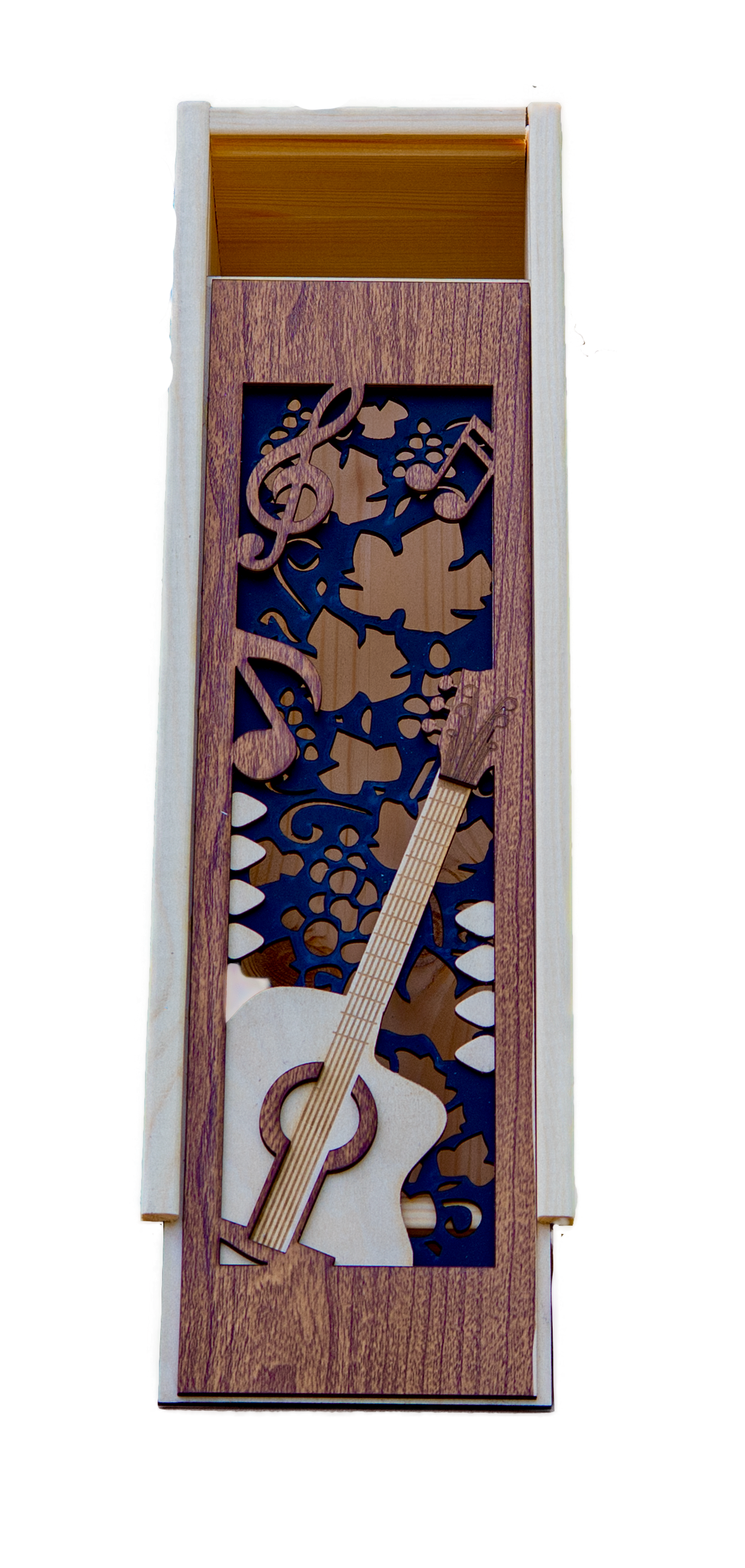 Breng wijn, kunst en muziek samen in één verfijnd kunstwerk. Dit exclusieve wijnkistje is met de hand vervaardigd en ontworpen voor één bijzondere fles wijn. Elk kistje is een uniek kunstobject, zorgvuldig opgebouwd uit meerdere lagen hout met een prachtig uitgesneden gitaar – een subtiele ode aan muzikaliteit en ambacht.